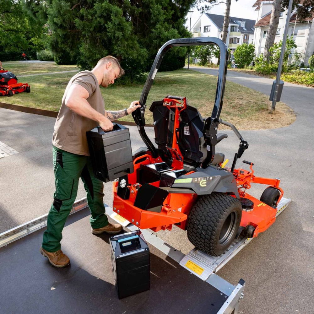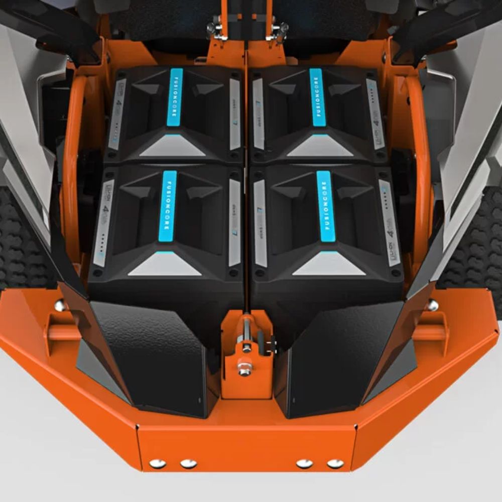 Professional battery-powered zero-turn mower delivering petrol-level performance with quiet, emission-free operation and exceptional durability. Features FusionCore interchangeable batteries, 122cm cutting deck, fast charging capability, and precision manoeuvrability for efficient commercial mowing across large and demanding areas.