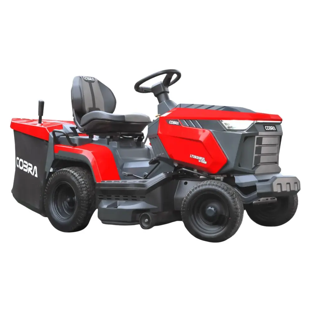 The Cobra LTX92HR2L lawn tractor features a 586cc V-Twin engine, 92cm twin-blade cutting deck, and hydrostatic transmission. With an LCD dashboard, 280-litre collector, and comfortable seating, it delivers smooth, efficient mowing for medium to large gardens.