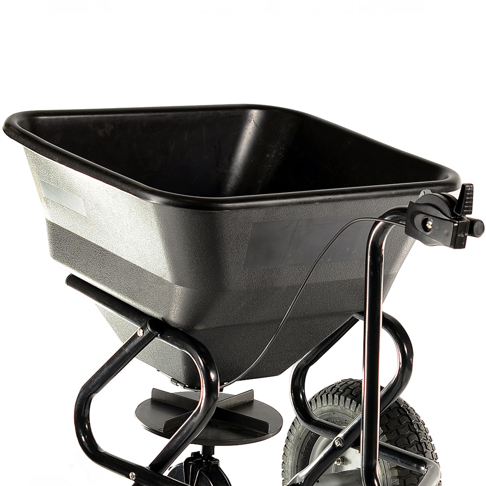 The corrosion resistant poly hopper can is suitable for use with a wide range of dry material, including lawn feed, seed, and ice-melt. It has a spread width of 8-10 feet, and the rate of spread is easily adjustable.