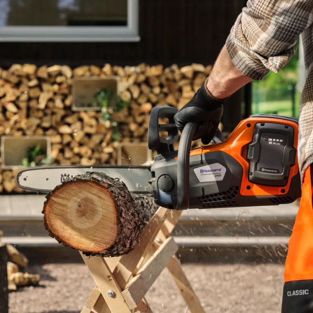 The Husqvarna 242i battery chainsaw delivers high and reliable cutting power for demanding garden and firewood tasks. It handles frequent firewood cutting, occasional tree felling, and clearing work with consistent strength and efficiency. The increased chain speed and optimised torque ensure clean cuts through dense timber and challenging materials. This performance allows you to work faster while maintaining excellent control and professional cutting results. The advanced Max Torque Technology ensures reliable power output during every cut and demanding task. This technology also reduces the risk of the chain getting stuck, improving safety and productivity. You can confidently tackle tough jobs knowing the chainsaw delivers consistent and dependable performance every time.