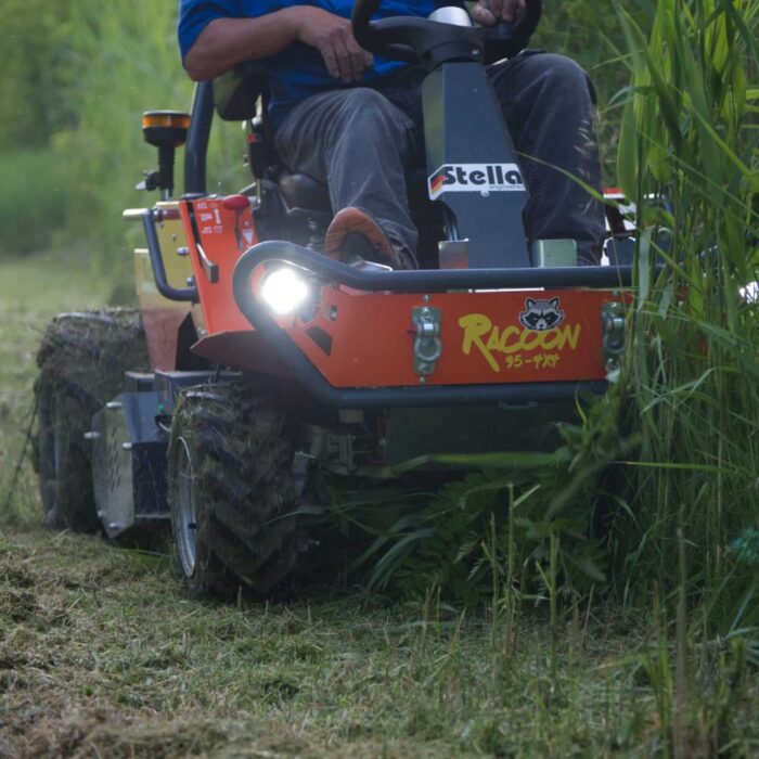 The Racoon ride-on mower excels in steep and uneven terrains, thanks to its balanced design and all-wheel-drive capability. Its low centre of gravity and wide lane width offer excellent stability, reducing the likelihood of tipping over on inclines. The all-wheel-drive system, along with a 100% engageable differential lock, guarantees superior traction, allowing the Racoon to handle extreme slopes safely and efficiently.