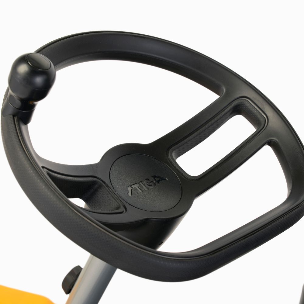 Thanks to its 50:50 articulated steering and rear-wheel drive, the Park 500 offers exceptional manoeuvrability. The power-assisted steering makes turns smooth and effortless, enabling you to navigate easily around garden obstacles like trees and flower beds. The articulated steering design ensures precise control, even in tight corners and narrow spaces. This feature is perfect for more complex garden layouts, providing flexibility and superior handling for even the most intricate mowing tasks.